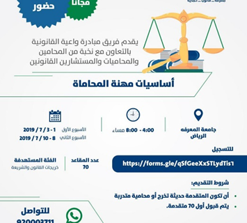 Awareness Program for Graduates of law and ShariaAlMaarefa RankingSeptember 26, 2023Part of the legal awareness program for graduates of law and Sharia at Al-Maarefa University in Riyadh. Today, the Legal ... اقرأ أكثر