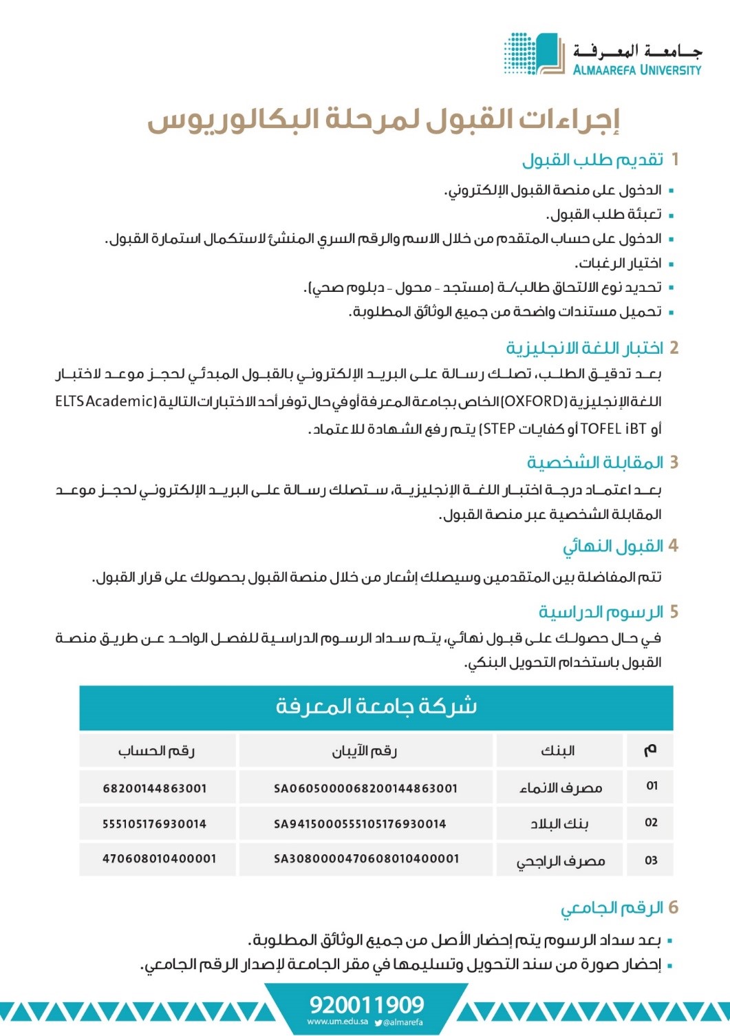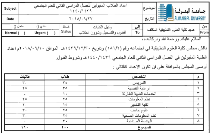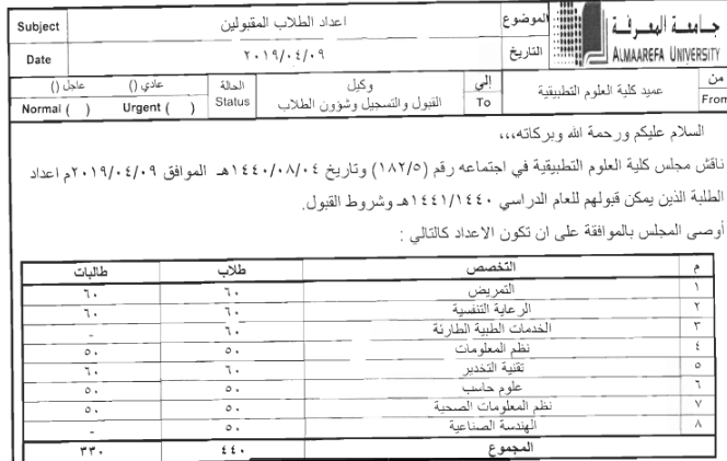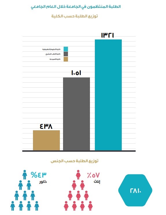 The following statistics reveal the application and acceptance rates for the previous three academic years. The numbers indicate the presence of equal opportunities and non-discrimination for admission among female and male applicants. Additionally, the increasing number of female students’ acceptance shows that Almaarefa University is an appealing environment for females to pursue their education in fields that are traditionally male-dominated.