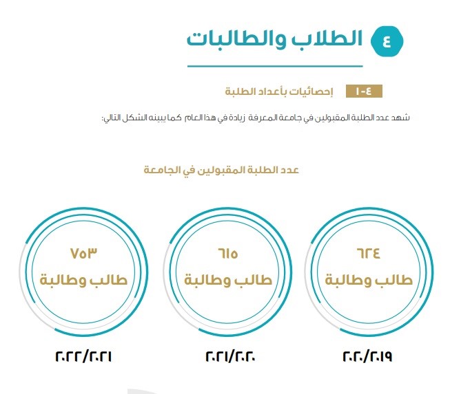 Al Maarefa University systematically tracks key metrics related to women’s participation in education, including application rates, acceptance and entry rates, and study completion rates. This data is collected and analyzed to ensure that women are supported throughout their academic journey. The university focuses on identifying areas where women may face challenges, particularly in underrepresented fields, and implements targeted policies and programs to support their success. These efforts are aligned with Al Maarefa’s broader commitment to gender equality and its efforts to foster an inclusive academic environment.
