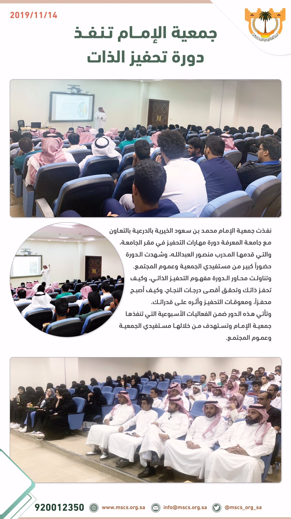Within the weekly activities carried out by #جمعية_الإمام for its beneficiaries and the general community, the Association, in cooperation with Al-Maarefa University, implemented a motivational skills course, which was presented by the trainer, Mr. Mansour Al-Abdullah.