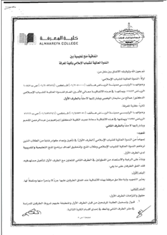 In 1.09.2010, Al Maarefa University signed a cooperation agreement with WAMY in order to qualify and prepare the new youth generations to attain their proper education journey. This agreement provides educational grants including six majors starting from medicine, pharmacy, nursing, respiratory therapy and ending with computer science and information system. The period of the agreement is three years that could be renewable with the acceptance of the both parties.