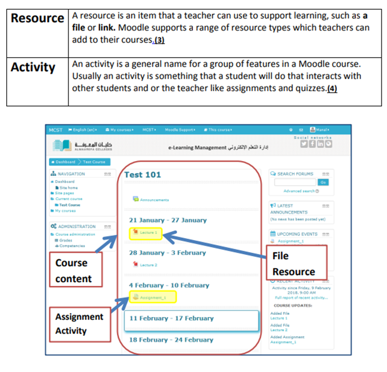 Moodle offers a large variety of activities that are designed to help your learning. When your instructors create activities they will name them. This means that they will not appear as simply Assignment or Wiki etc. on the course page, but will display with a meaningful title as set by your instructor.