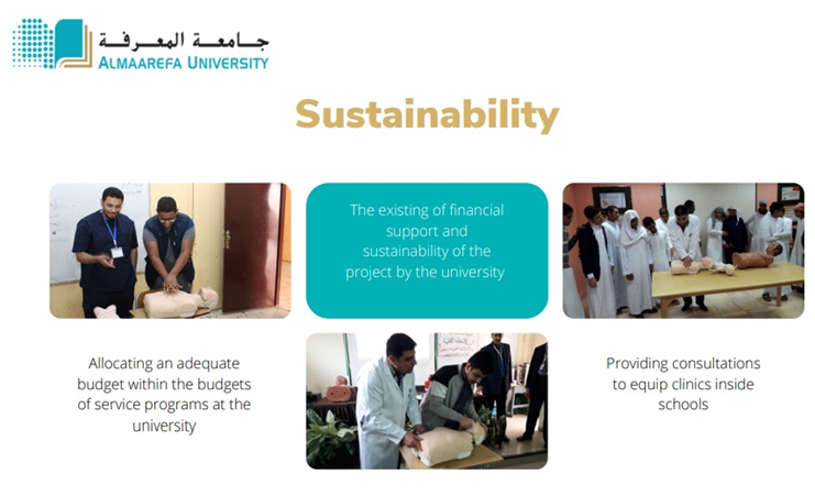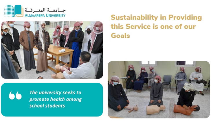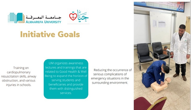 The initiative is currently being implemented. AlMaarefa University (UM), through the Social Responsibility Unit, has made advanced progress in reducing health disparities and literate against health, illness and preventable diseases. U M believes that healthy lives and promotion of well-being should be for all at all ages. · UM organizes awareness lectures and trainings that are related to Good Health & First Aid to expand the horizon of serving students and beneficiaries to provide them with distinguished services.