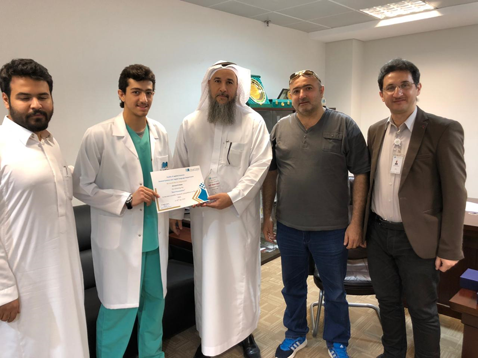 Under the patronage of the Dean of the College of Applied Sciences, Dr. Nasser Al-Jarallah, and the Head of the Department of General Sciences and English, Dr. Ibrahim Al-Atoum, and in the interest of Al-Maarefa University to appreciate and motivate its distinguished students, Ahmed Muhammad Al-Baba and Abdul Karim Kamel Al-Masri, students of medicine and surgery at the university, were honored for winning the best scientific research competition, which is entitled “Chemical Influence Human’s allergies” “It was admired by the competition committee, which was held on Sunday, 5/5/2019 at the university’s headquarters.