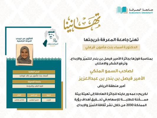 الدكتورة أسماء بنت مأمون قرملي خريجة #جامعة_المعرفة من أوائل الطبيبات السعوديات اللاتي حققن جائزة الأمير فيصل بن بندر للتميز والإبداع pic.twitter.com/dyqNlOJAZS