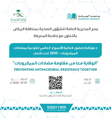 AlMaarefa University is organizing, in cooperation with the Ministry of Health, an event: “Together prevention of antimicrobial resistance”, on the occasion of #الأسبوع_العالمي_لمضادات_الميكروبات , 2022